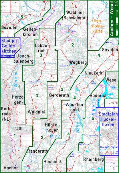 Auf dem Fahrrad direkt von Aachen nach Wesel: Eigentlich macht die Route einen leichten Bogen. Dadurch wird das Ballungsgebiet von Mönchen-Gladbach und Krefeld vermieden. So geht es erst nach Herzogenrath und Kerkrade, dann der Wurm folgend durch Geilenkirchen nach Hückelhoven. Dann Wegberg, Waldniel (zu Schwalmtal), Nettetal, Wachtendonk, Nieukerk (zu Kerken), Sevelen, knapp westlich an Kamp-Lintfort und Rheinberg vorbei, das letzte Stück auf dem Radwanderweg auf dem Rheindeich. | ||