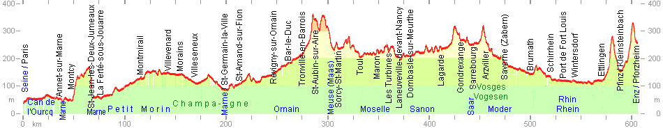 Vom Elsass in die Champagne folgt die Route überwiegend dem Rhein-Marne-Kanal (Canal de la Marne au Rhin), teilweise an dessen Ufer, oft nur im selben Tal.